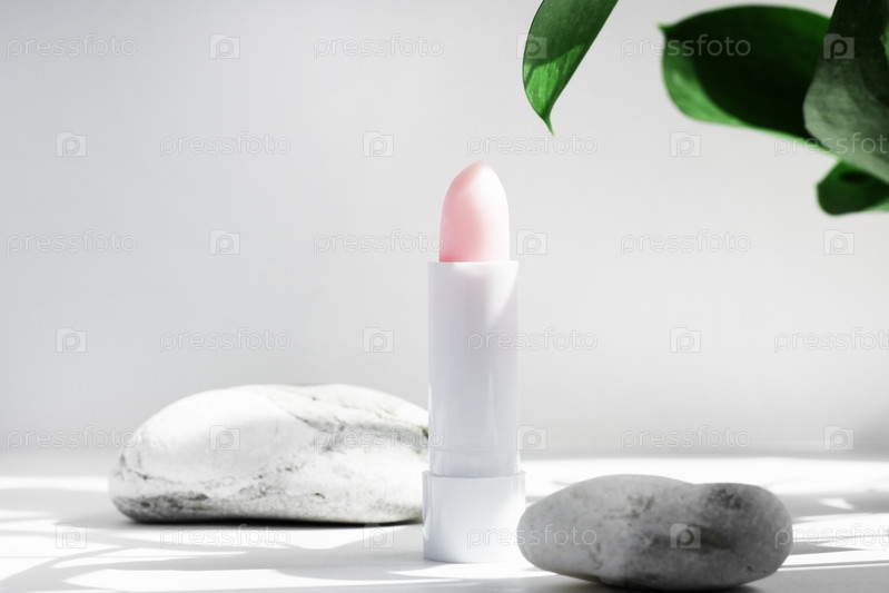 Уход за кожей губ. Крупным планом протектор губы помады на белом фоне, с тенью солнца. Концепция косметики красоты. Весенний или летний солнцезащитный крем или увлажняющая косметика