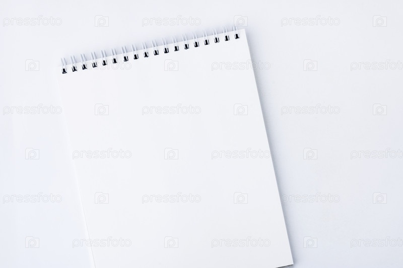 Белый открытый блокнот. Белый блокнот со спиральными страницами на белом фоне. Копировать пространство