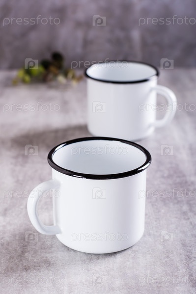 Две белые пустые металлические кружки на сером фоне в вертикальном виде