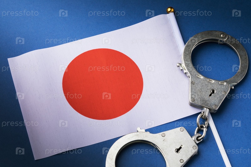 Флаг и наручники на синем фоне, концепция на тему преступности в японском обществе, вид сверху