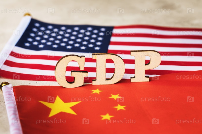 Текст деревянных букв на фоне флагов Китая и Америки, концепция сравнения ВВП США и Китая