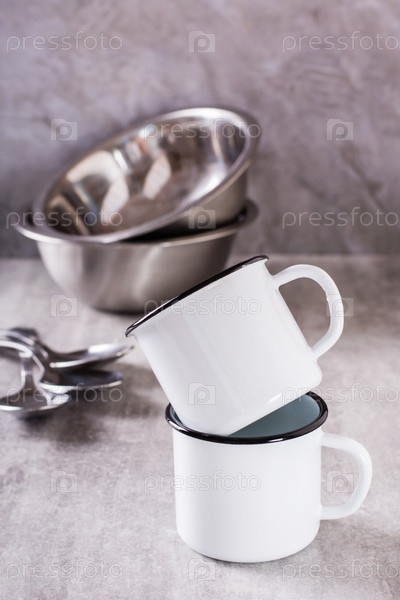 Две белые пустые металлические кружки, металлические миски и ложки на сером вертикальном фоне