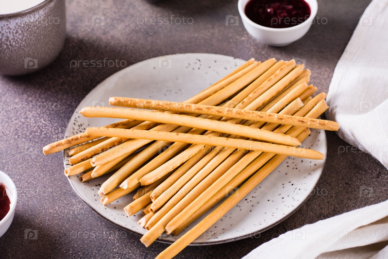 Хрустящие поджаренные сладкие соломинки с ягодным джемом на тарелке на десерт