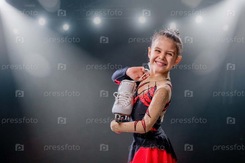 Портрет счастливой маленькой фигуристки с коньками в руках на ледовой арене, темный фон