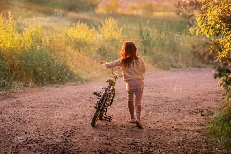 Маленькая девочка едет на велосипеде по сельской дороге на природе на закате