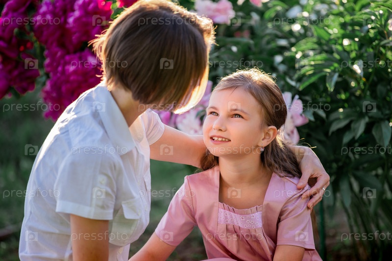 Прикладные семейные отношения. Мама и дочь сидят на скамейке и болтают в саду среди цветов солнечным летним вечером