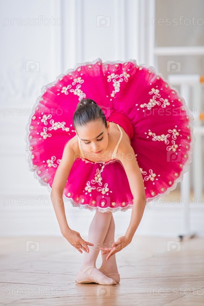 Маленькая балерина в ярко-розовой пачке стоит в позе в белом зале