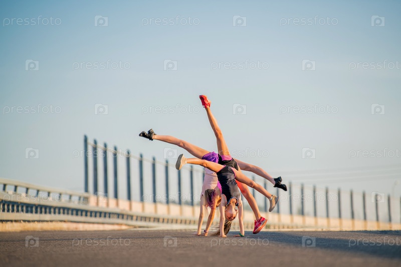 Девушки тренируются летом на улице, стоят на руках, ноги в шпагате