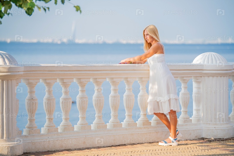 Элегантная роскошная женщина в белом платье, наслаждаясь видом на закат на набережной