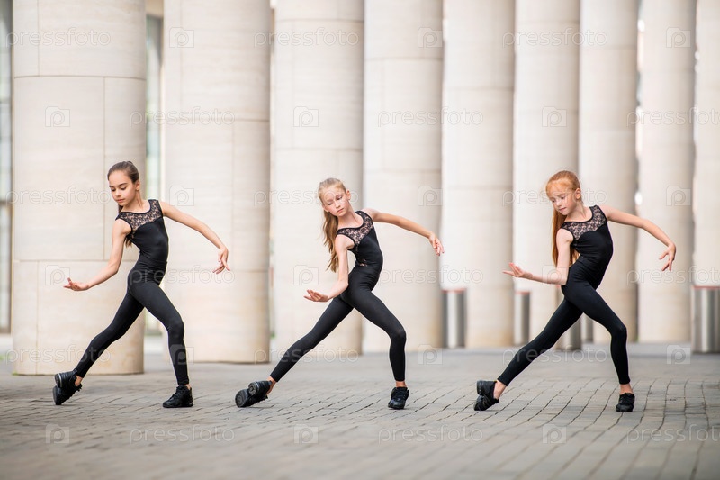 Группа из трех маленьких балерин в черных облегающих костюмах танцует на фоне городского пейзажа