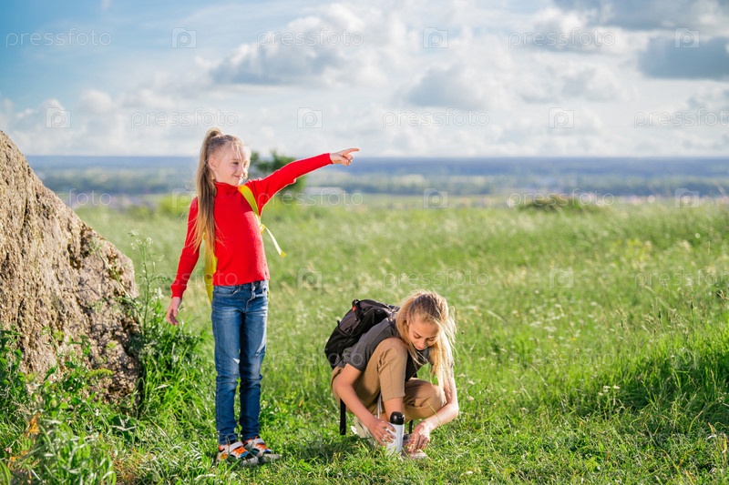 Дети с рюкзаками в походе в летнюю поездку на природу. Группа девочек-подростков наслаждается прогулкой