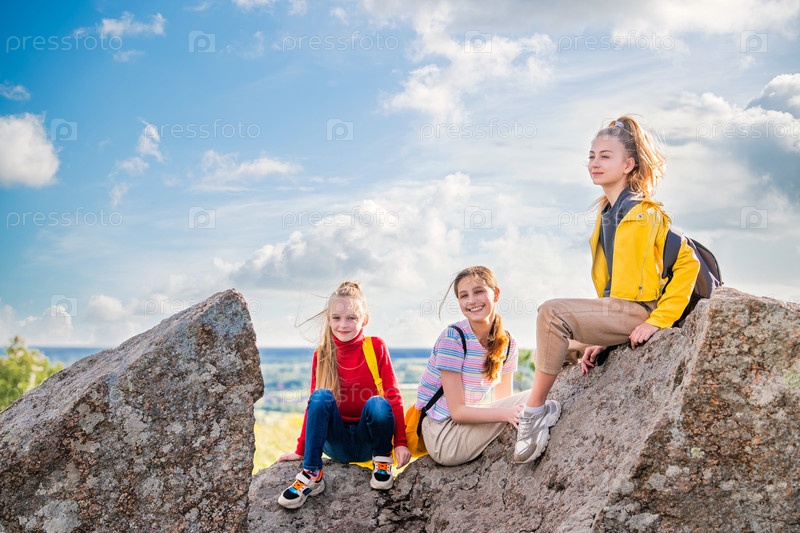 Люди с рюкзаками отправляются в летнюю поездку в горы. Группа девочек-подростков наслаждается поездкой
