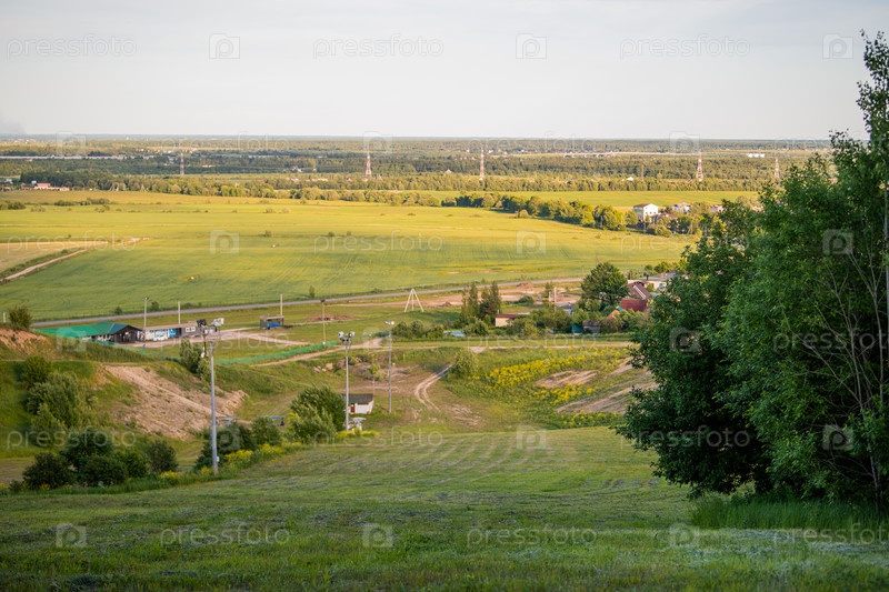 Панорамный вид с горы на небольшой сельский поселок среди полей и лесов на закате летом