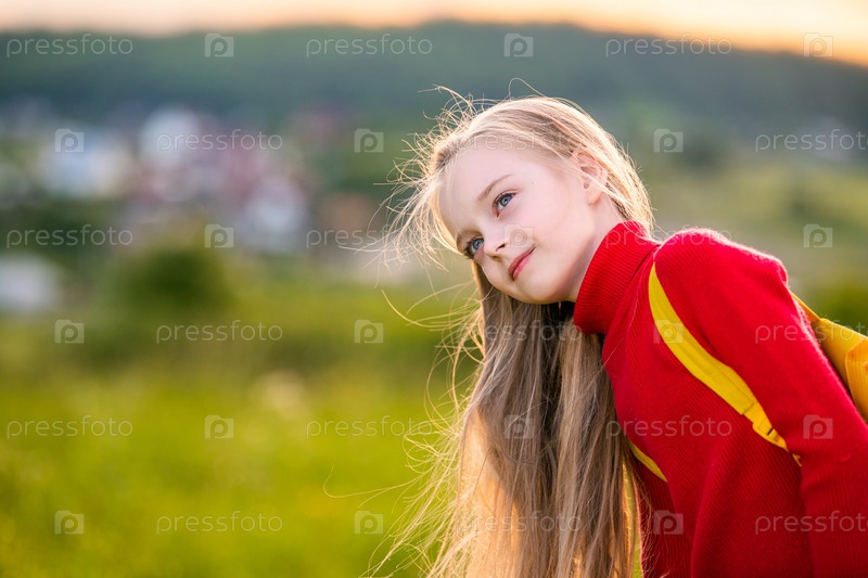 Портрет девочки в красном джемпере с рюкзаком, путешествующей летним вечером на фоне пейзажа