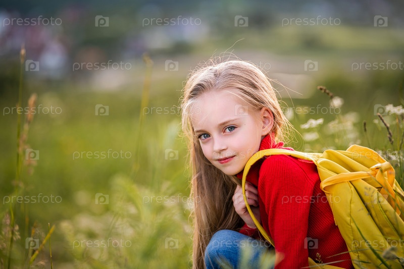 Портрет девочки в красном джемпере с рюкзаком, путешествующей летним вечером на фоне пейзажа
