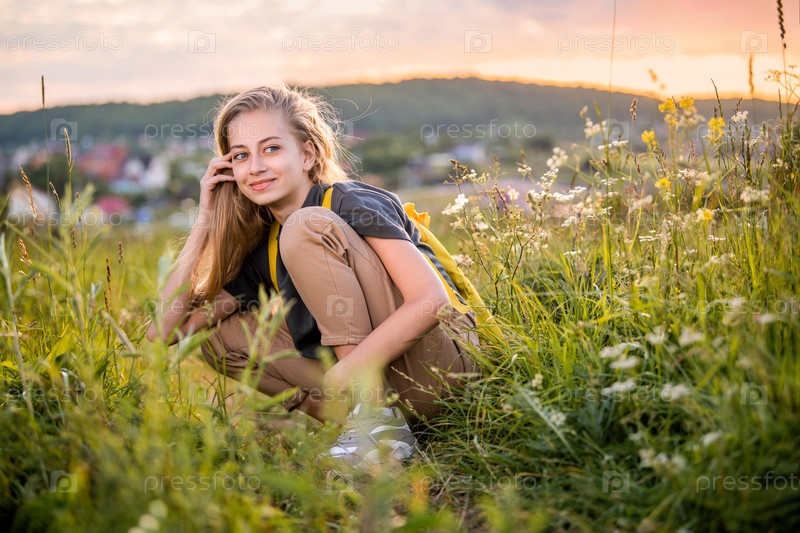 Портрет девочки-подростка с рюкзаком, путешествующей летним вечером на фоне пейзажа и заката