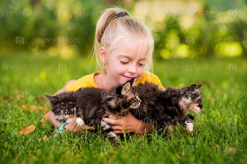 Маленькая девочка играет с маленькими котятами в теплый и солнечный летний день