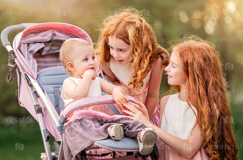 Две старшие рыжие сестры гуляют в парке в солнечный летний день с коляской со своей младшей сестрой. Девочки пытаются успокоить жуткую девочку, у которой режутся зубки