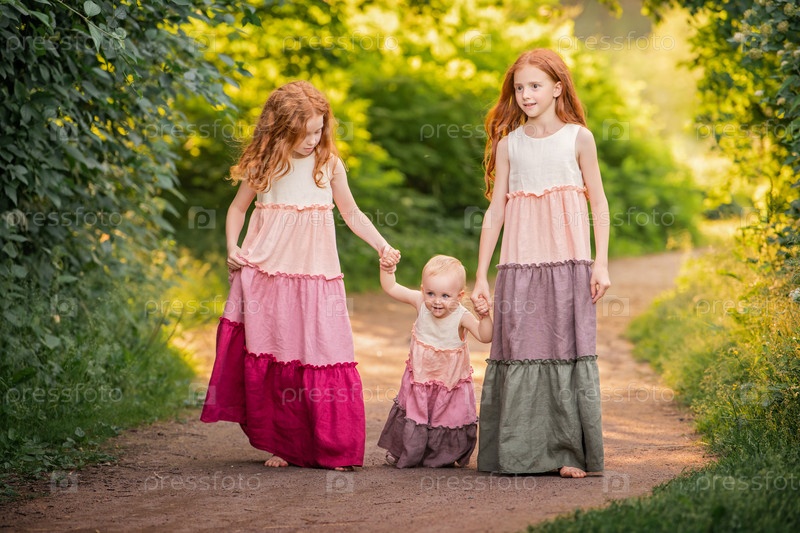 Три рыжеволосых девушки в длинных платьях бегут босиком по дорожке в парке навстречу закату