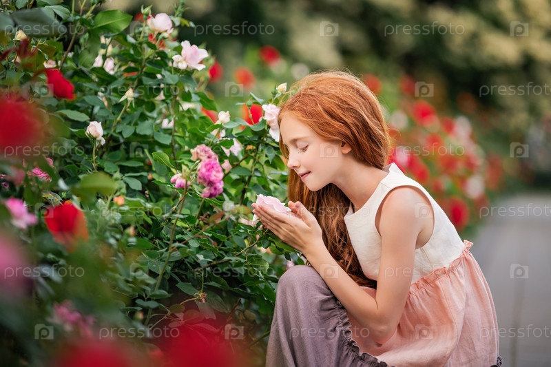 Рыжеволосая девочка летом нюхает розу в цветущем саду