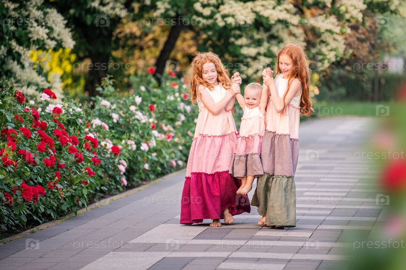 Три рыжеволосые сестры в длинных льняных платьях весело гуляют в саду с розами летним вечером
