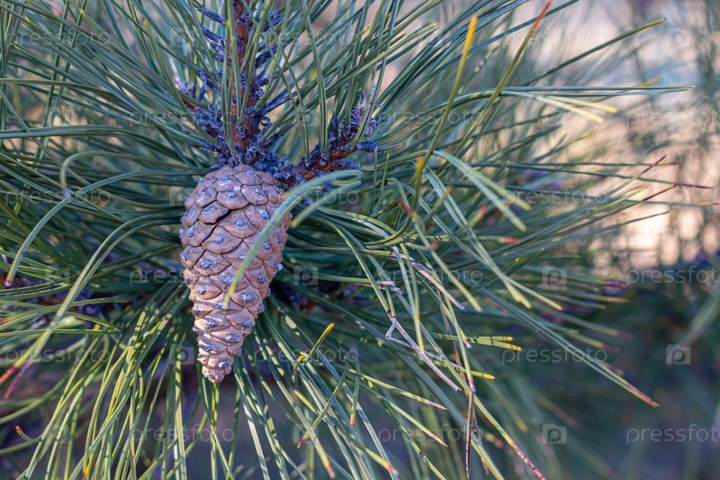 Фотография крупным планом зеленой игольчатой сосны. Маленькие сосновые шишки на концах ветвей. Размытые сосновые иголки на заднем плане
