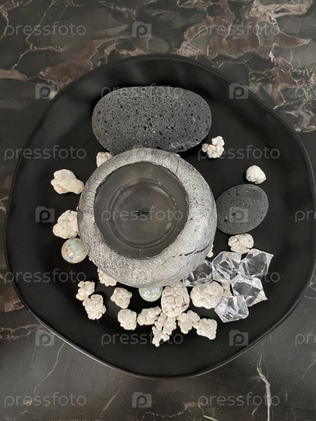 Это вид сверху на тарелку для дизайна интерьера, наполненную свечами, камнями, кораллами