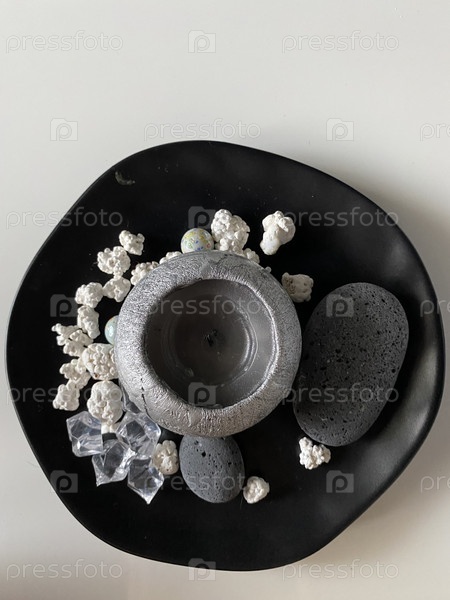 Это вид сверху на тарелку для дизайна интерьера, наполненную свечами, камнями, кораллами на белом фоне