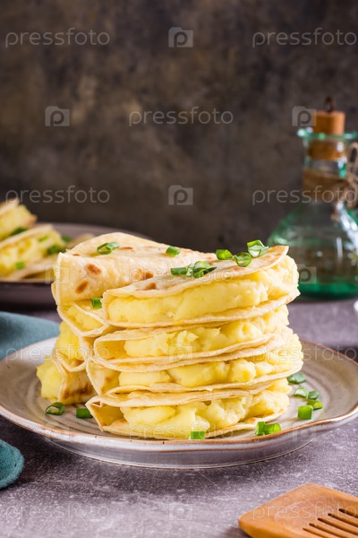 Кыстыбы - тонкие лепешки с начинкой из картофельного пюре и лука на тарелке. Вертикальный вид