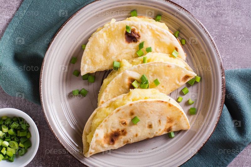 Тортильи с картофельным пюре и луком на тарелке крупным планом