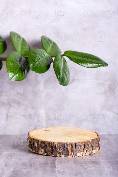 Естественный макет спила дерева и ветки с листьями на сером фоне. Вертикальный вид