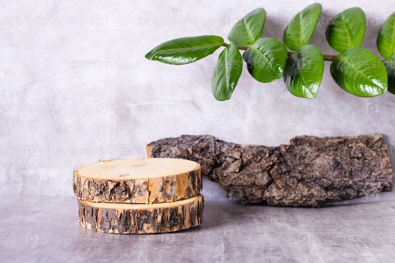 Натуральный макет ломтиков дерева, коры и ветки с листьями на сером фоне