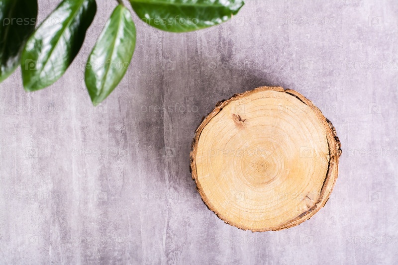 Естественный макет спила дерева и ветки с листьями на сером фоне. Вид сверху