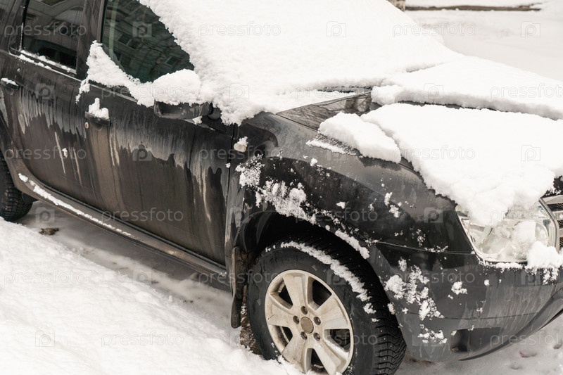 Замерзший автомобиль, покрытый снегом в зимний день, лобовое стекло и капот в снегу