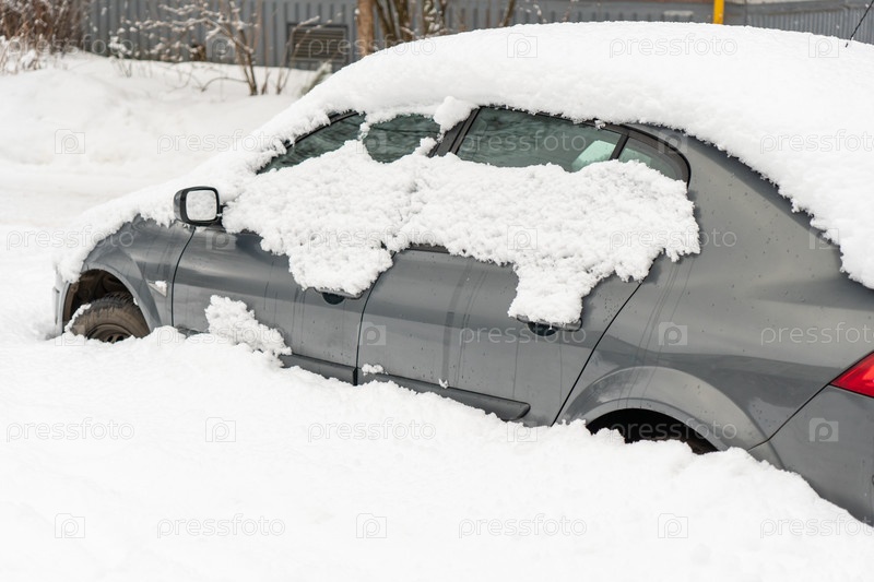 Замерзший автомобиль, покрытый снегом в зимний день, лобовое стекло и капот в снегу