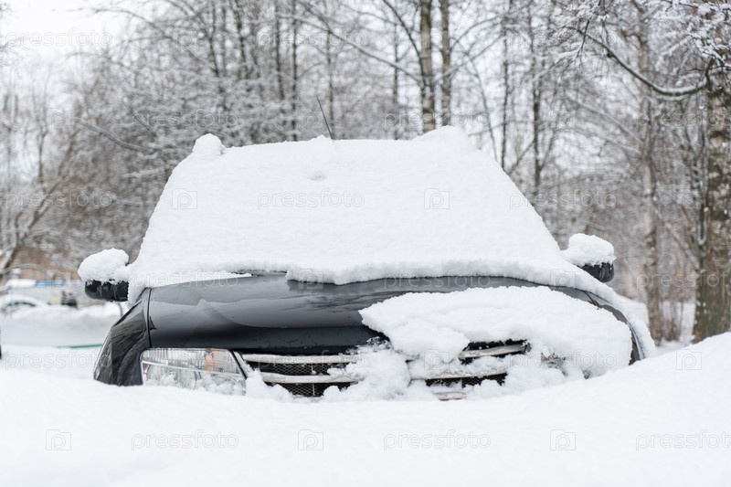 Замерзший автомобиль, покрытый снегом в зимний день, лобовое стекло и капот в снегу