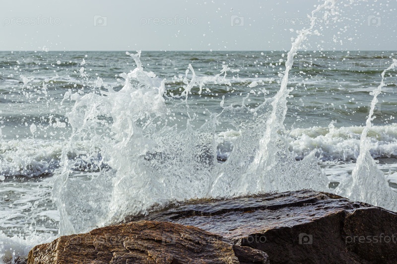 Кадр морского прибоя. Брызги воды ударяются о камень. Океанский прибой среди скал. Фон прилива