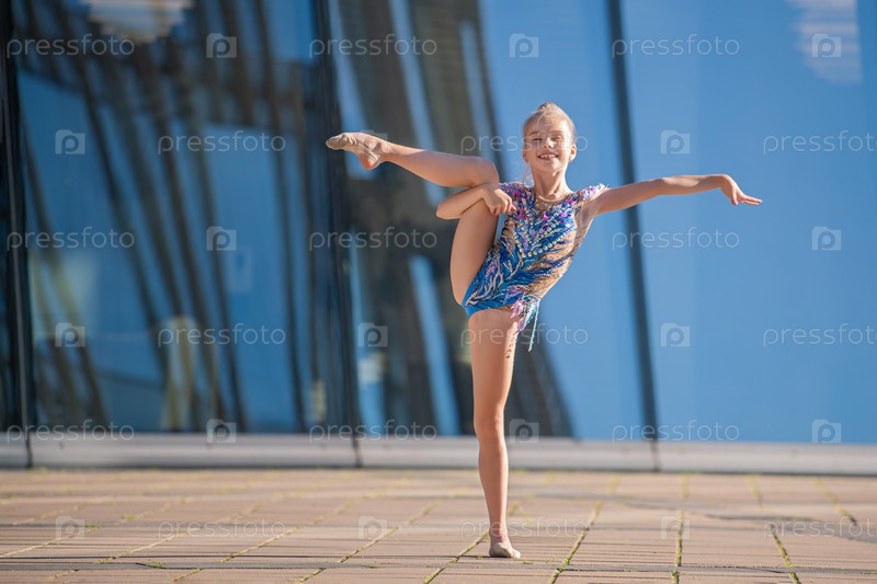 Девушка-гимнастка школьного возраста в красивом кроссовом платье с черным костюмом выполняет упражнение без предмета