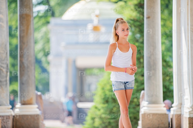 Портрет стройной юной девочки-подростка на фоне античной архитектуры в парке