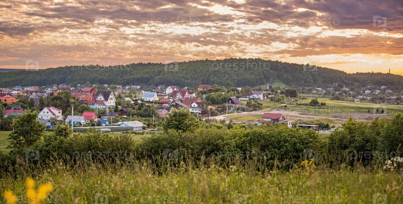 Панорамный вид с горы на небольшой сельский поселок среди полей и лесов на закате летом