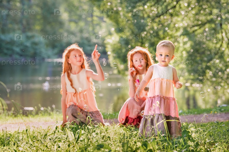 Три рыжеволосые сестры в длинных льняных платьях пускают мыльные пузыри в парке в солнечный летний день