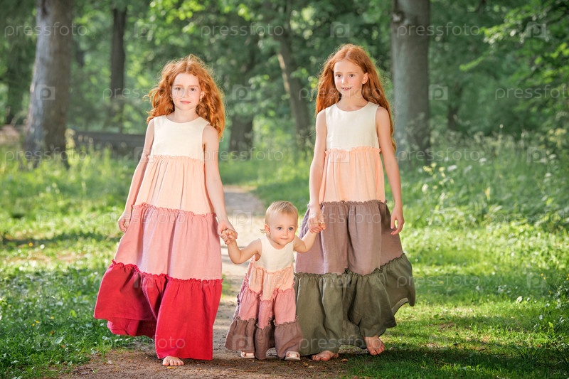 Три рыжеволосые сестры в длинных льняных платьях пускают мыльные пузыри в парке в солнечный летний день