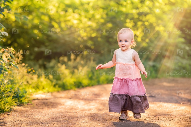 Маленькая годовалая девочка в длинном винтажном льняном платье летом бежит по залитой солнцем дорожке в парке