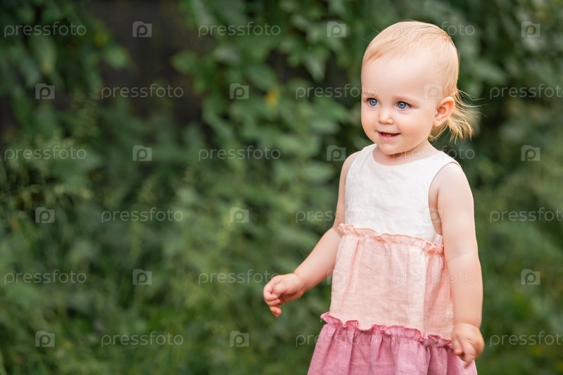 Маленькая голубоглазая девочка гуляет по саду летом в длинном винтажном льняном платье