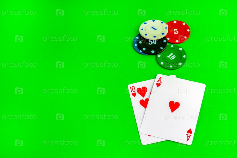 Игра в покер, туз и десять карт и фишек на покерном столе