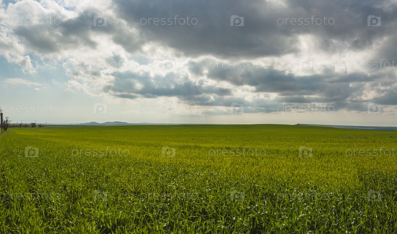 Поле молодой зеленой пшеницы на фоне неба со свинцовыми облаками
