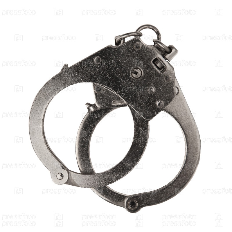 Закрытые наручники, изолированные на белом фоне. Понятие преступления и наказания