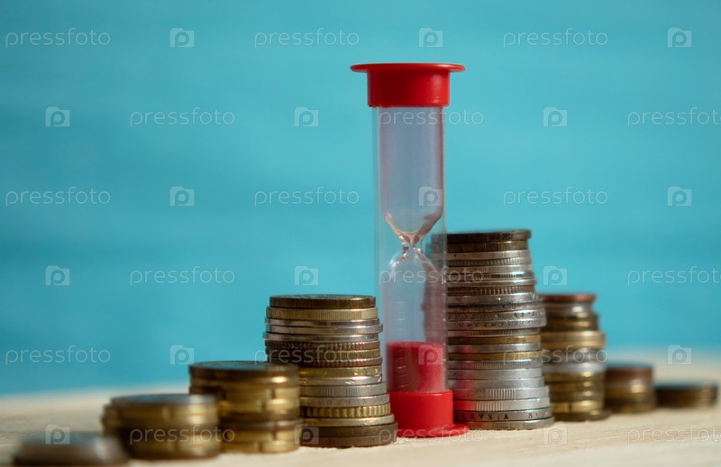 Песочные часы красного цвета среди стопок различных монет. Концепция времени и денег. Выборочный фокус. Синий фон