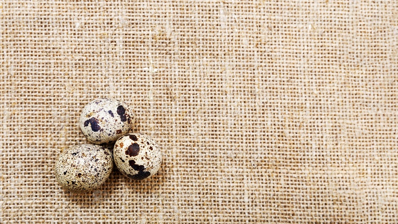 Фон из мешковины с тремя маленькими пятнистыми перепелиными яйцами