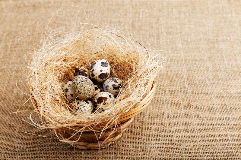 Гнездо крупным планом с маленькими пятнистыми перепелиными яйцами